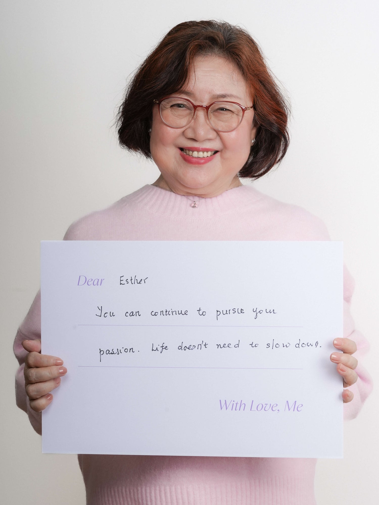 Today, two years after beating cancer, Esther has channeled her energy into joyful new pursuits, from volunteering with children's reading programs to lifting her voice in a choir. Her journey is a powerful testament that a diagnosis isn't an end but a chance to embrace life with renewed purpose, beautifully embodying her message to herself: "You can continue to pursue your passion. Life doesn't need to slow down." -