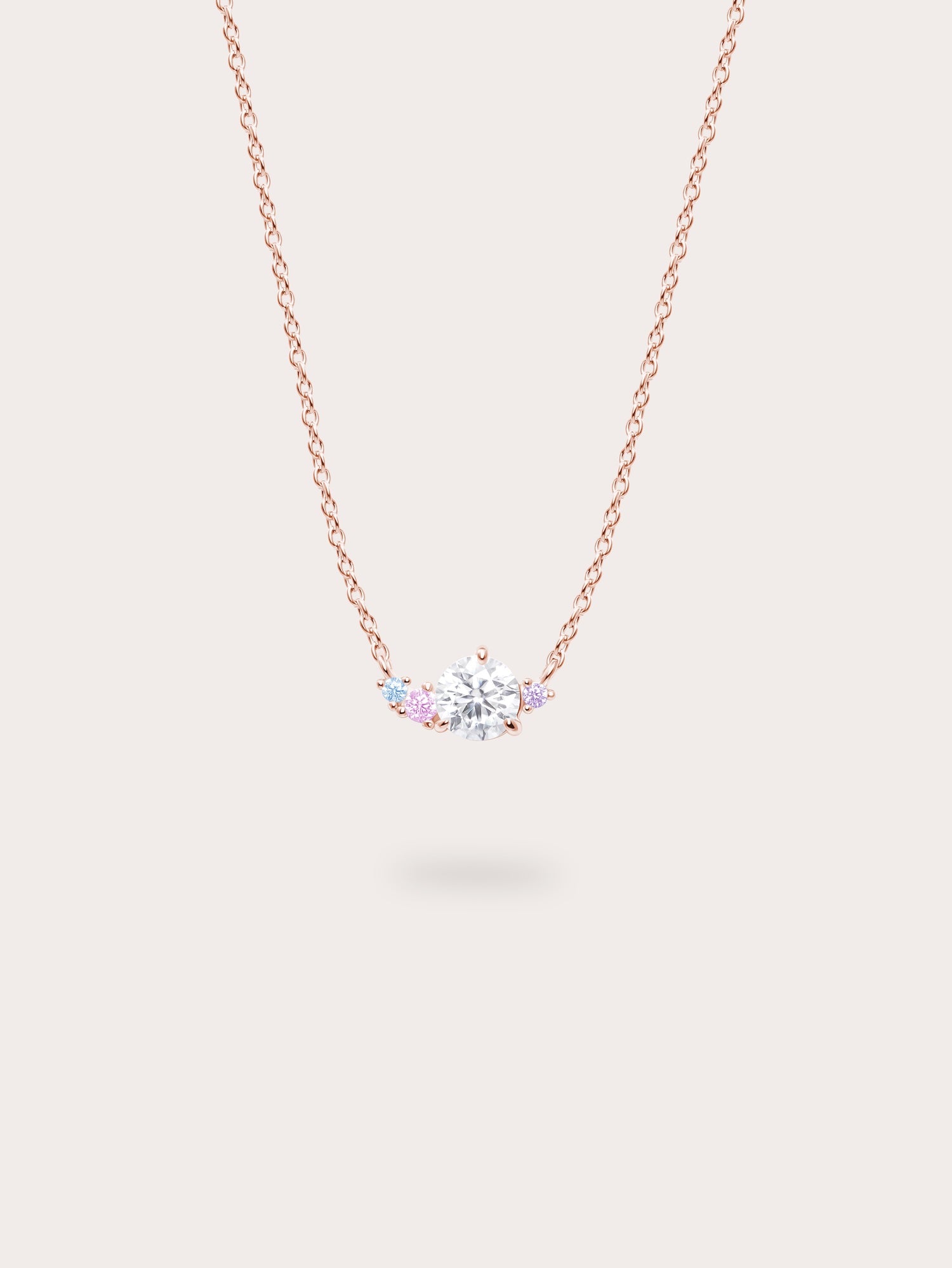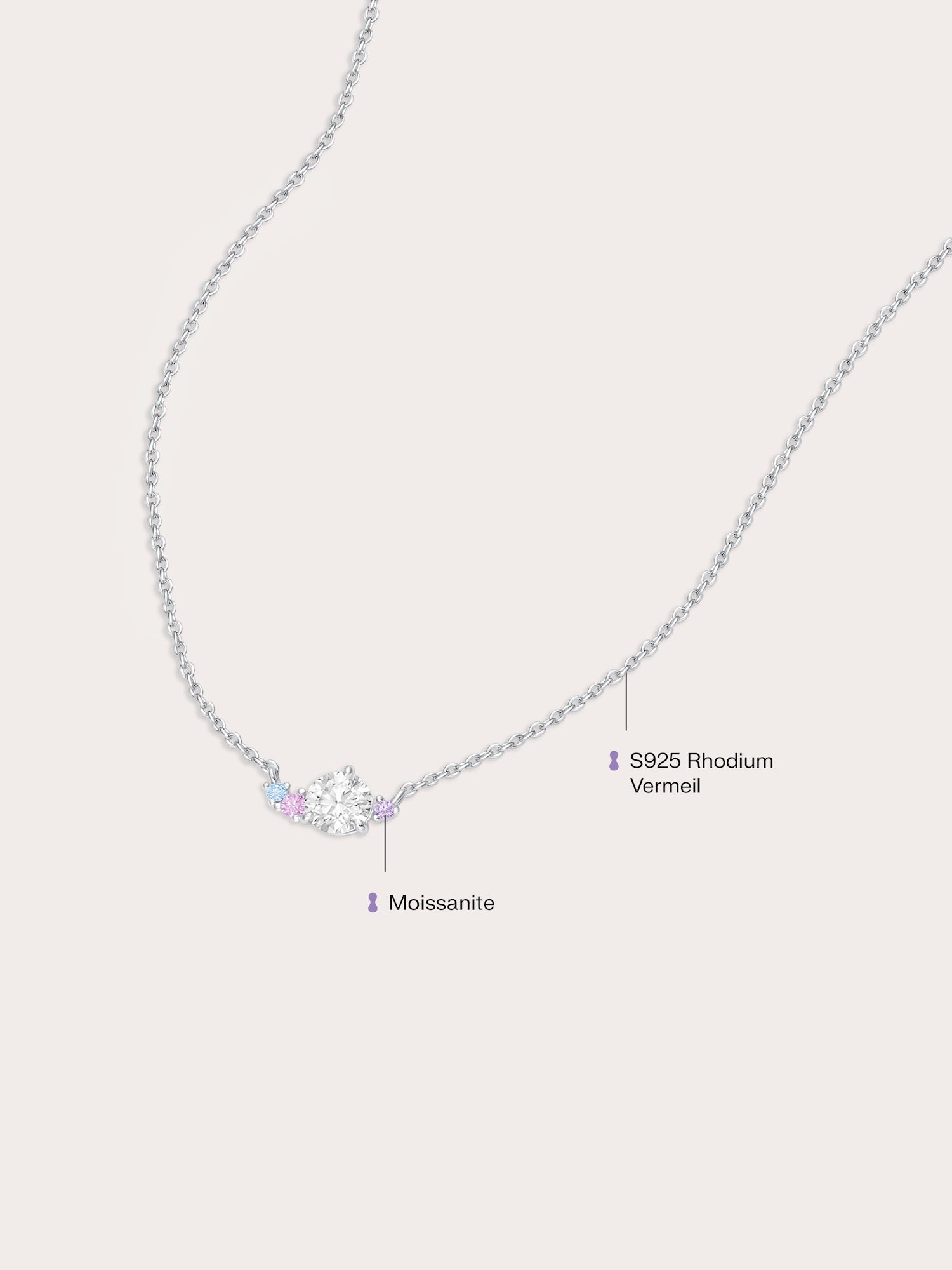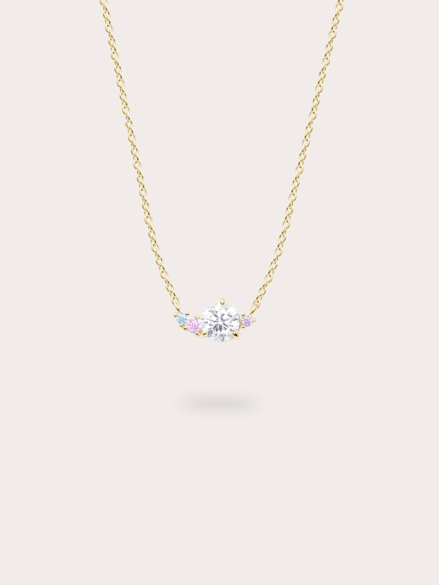 The Aurora Moissanite Cluster Necklace features a 0.5ct focal moissanite, accented with three pastel moissanites (1.5–2mm) in hues of pink, lilac, and blue. The subtle gradient adds a hint of color while maintaining a clean, refined look that complements any outfit. Handcrafted in 18k gold vermeil.