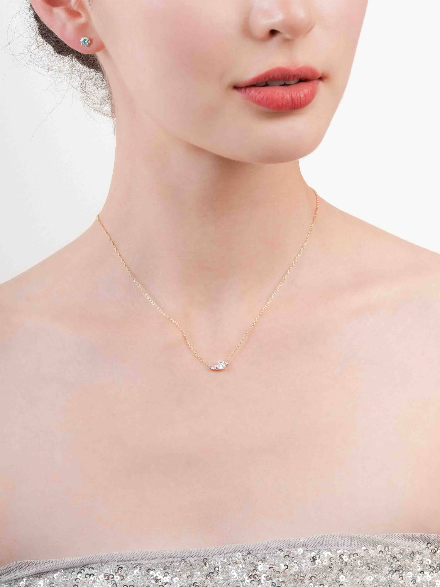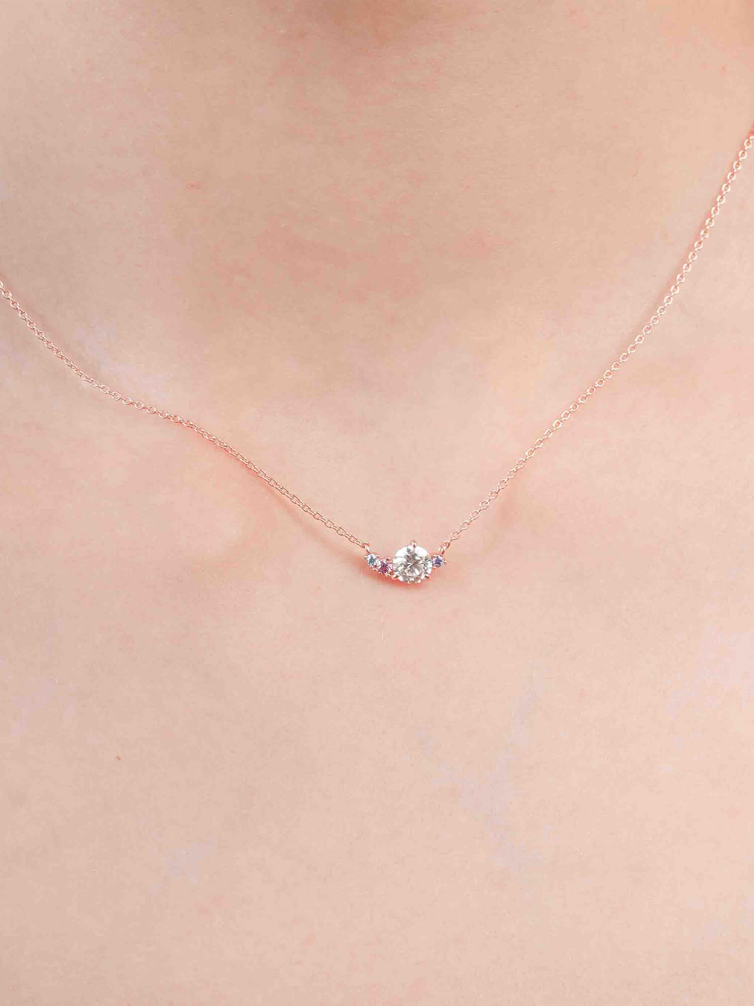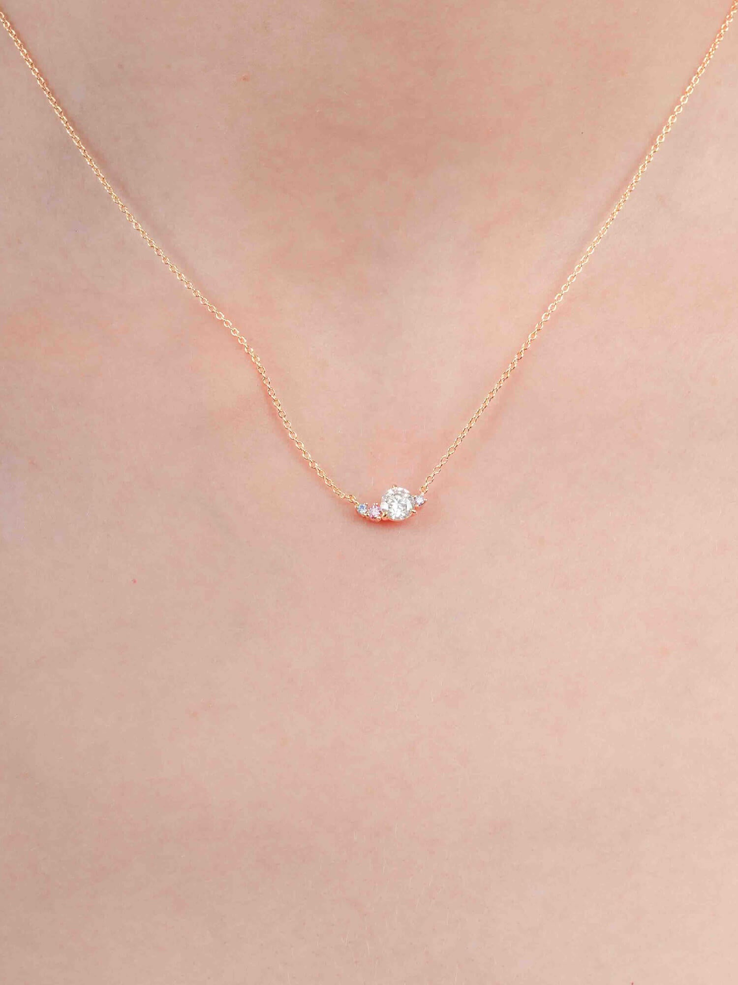 The Aurora Moissanite Cluster Necklace features a 0.5ct focal moissanite, accented with three pastel moissanites (1.5–2mm) in hues of pink, lilac, and blue. The subtle gradient adds a hint of color while maintaining a clean, refined look that complements any outfit. Handcrafted in 18k gold vermeil.