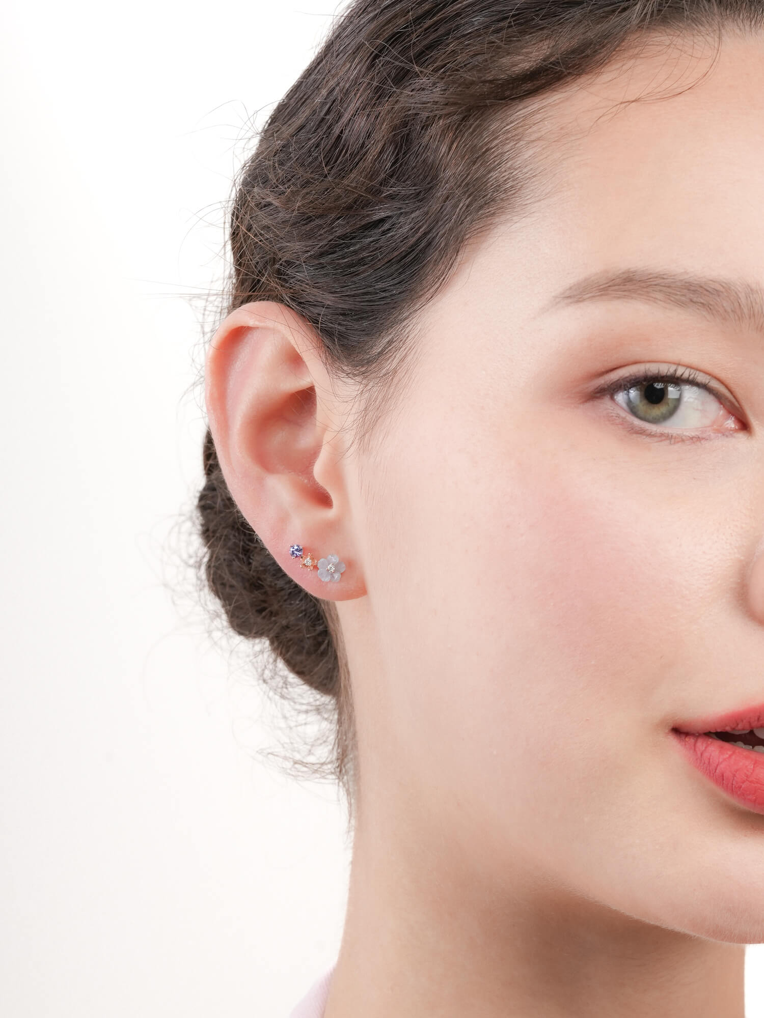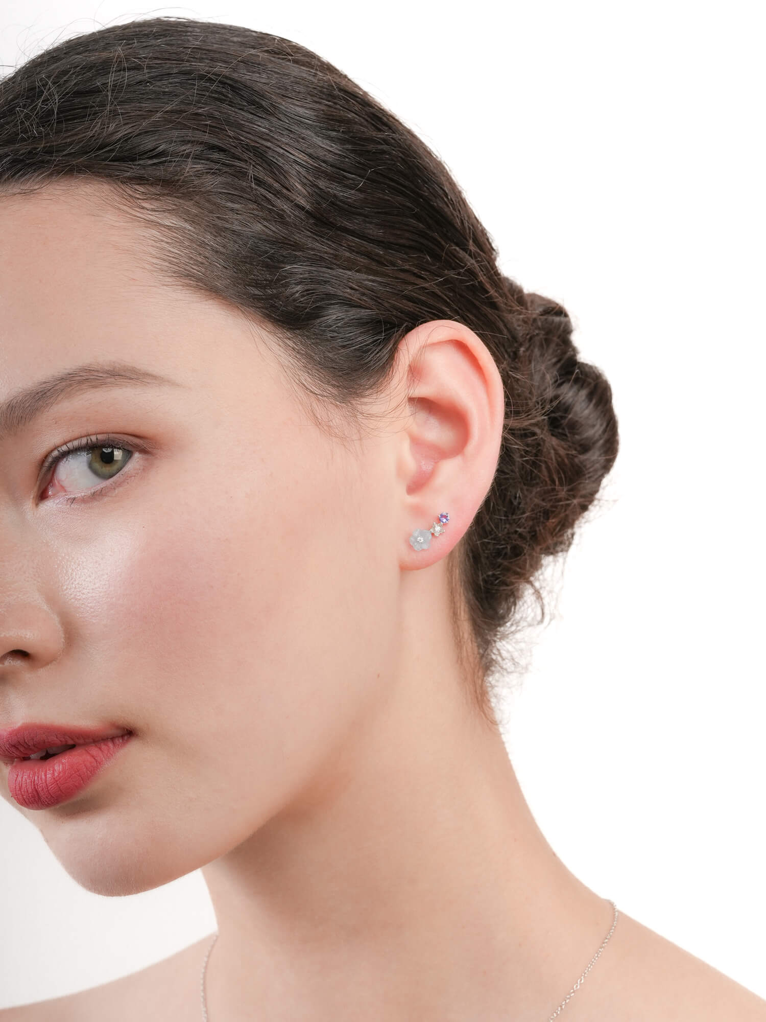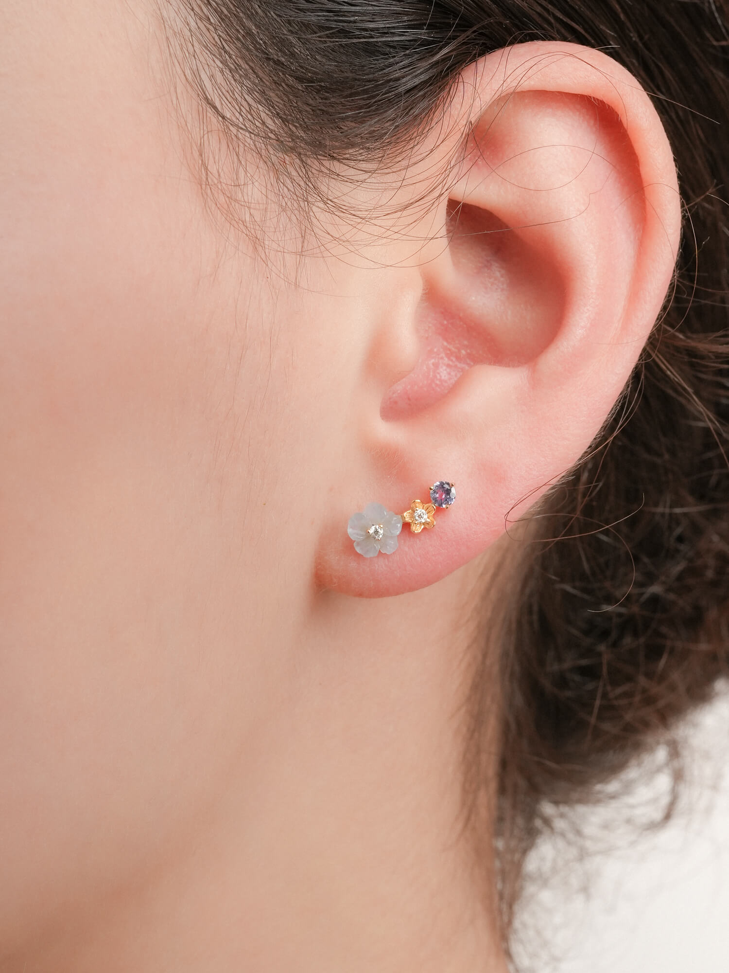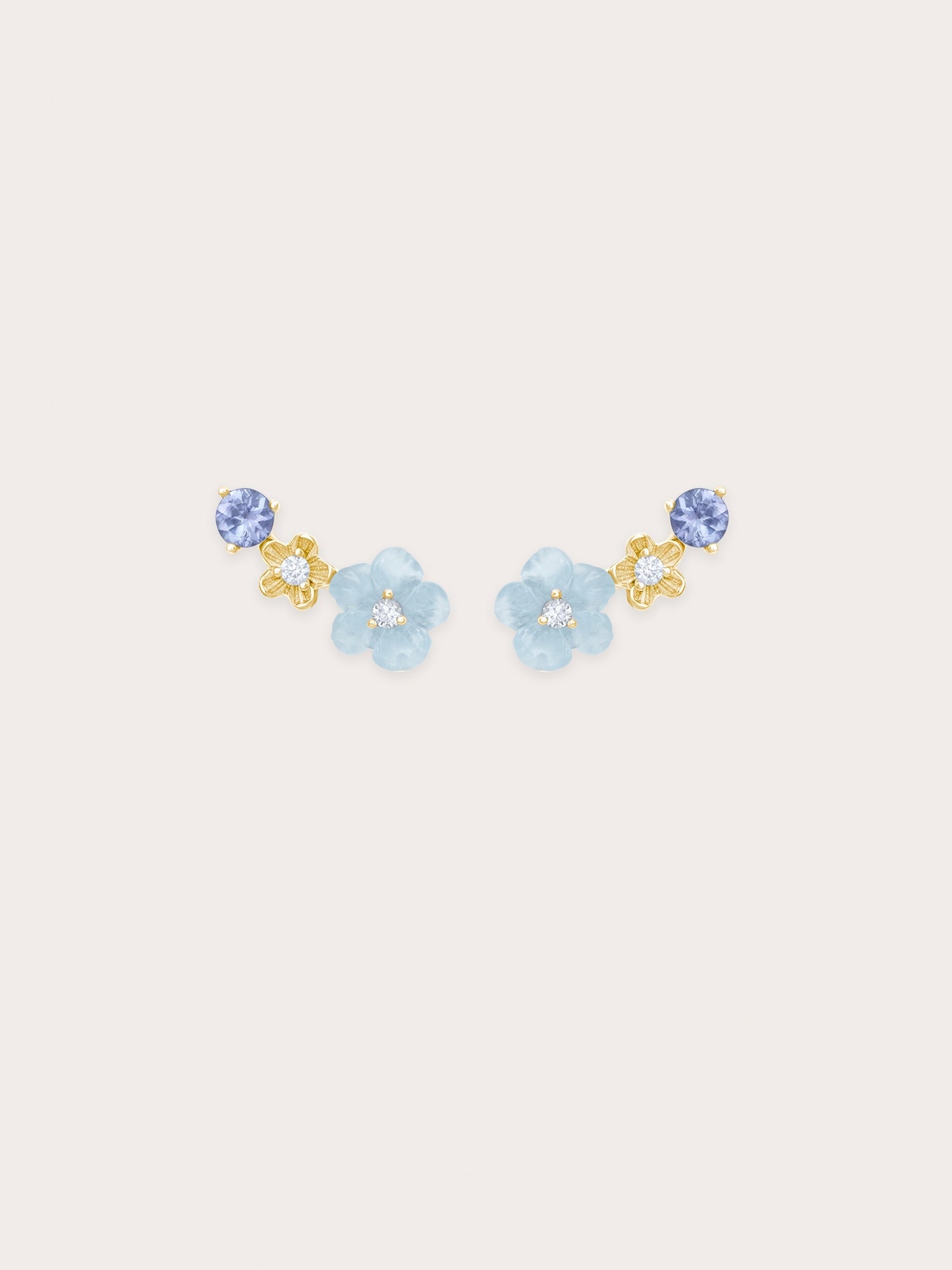 The dainty Blue Flower Climber Earrings feature a graceful arrangement of hand-carved aquamarine, tanzanite gemstone, and moissanite-accented metal bloom. Lightweight and easy to wear. Handcrafted in 18k rose gold vermeil.
