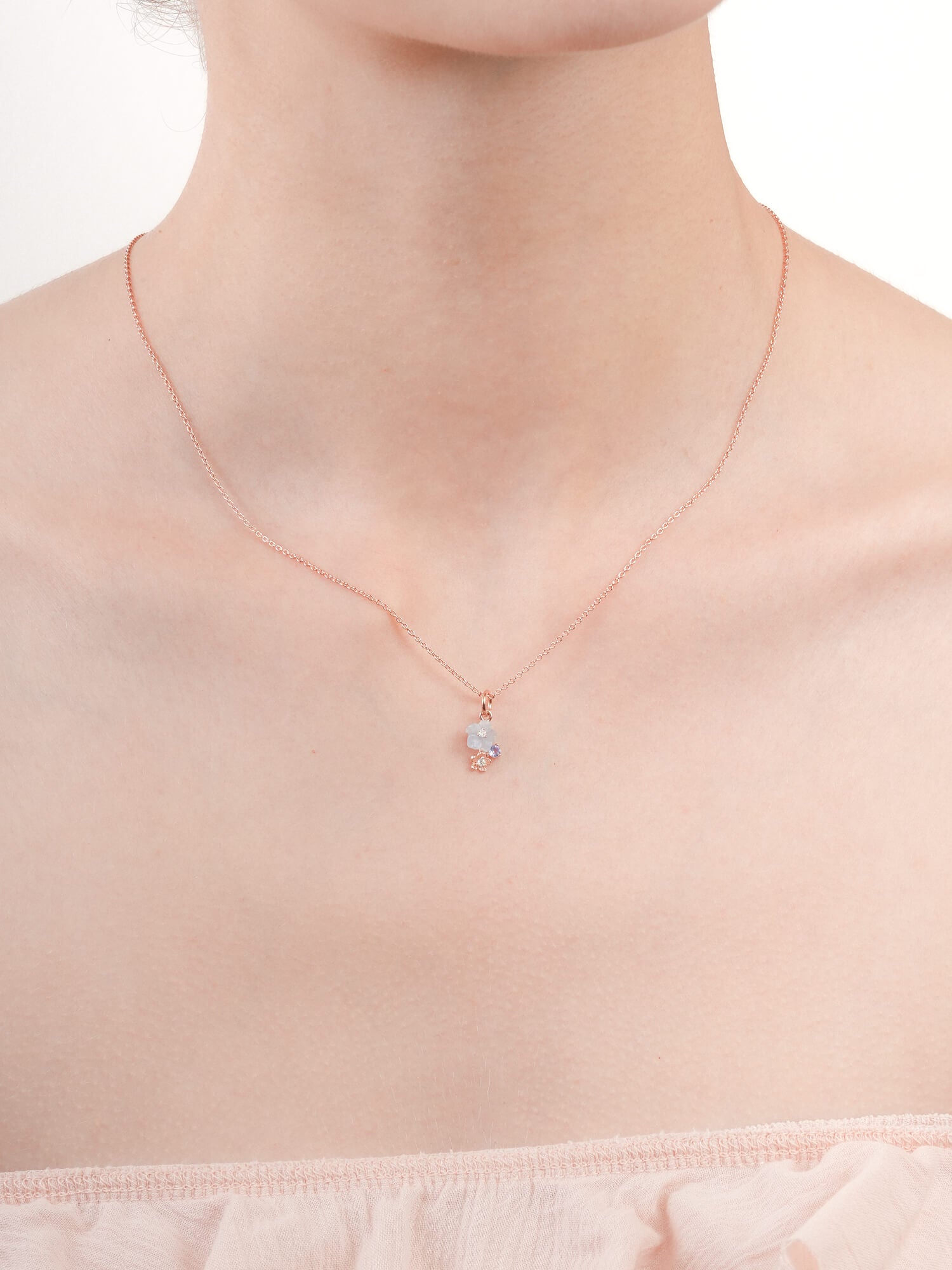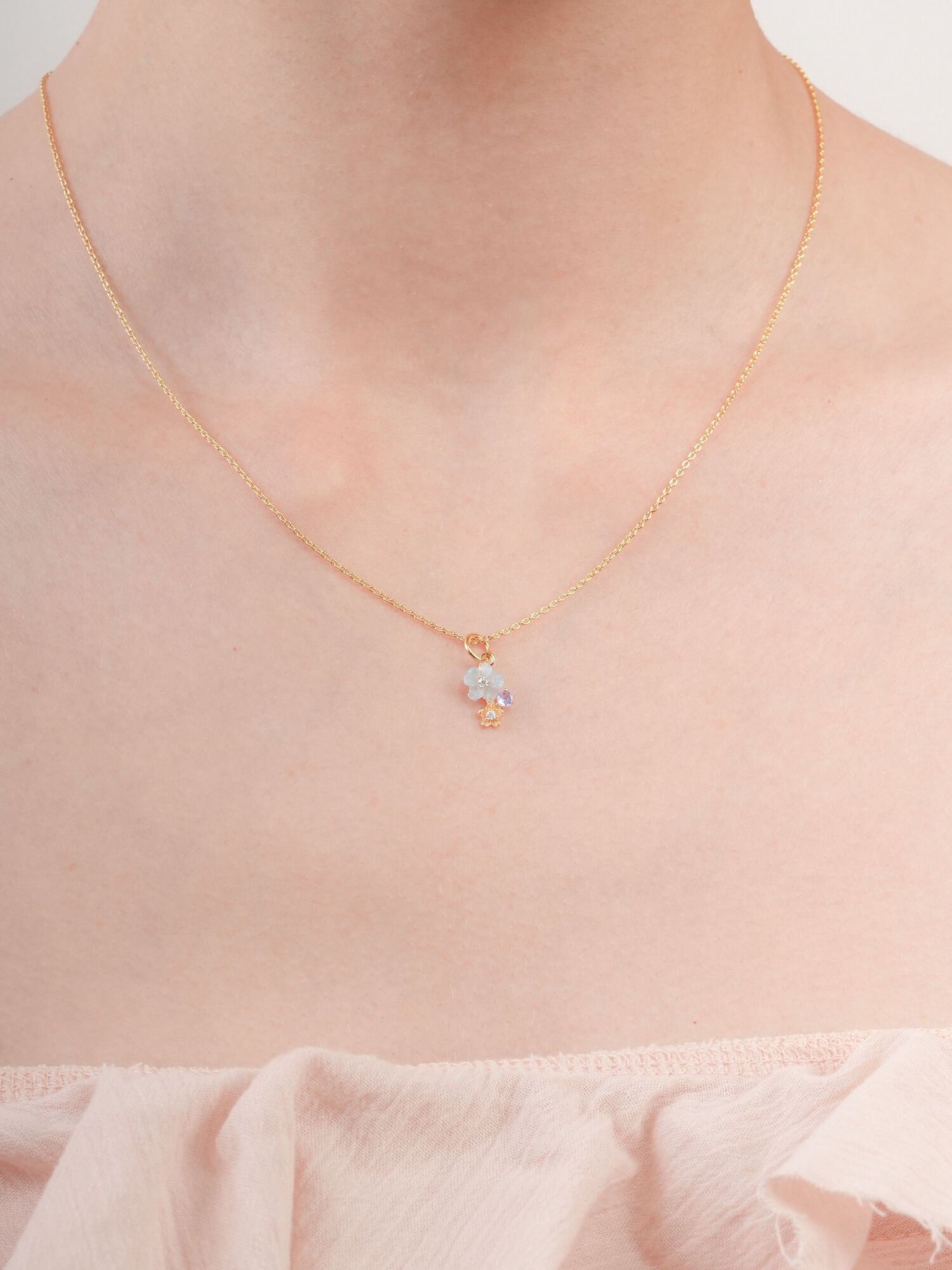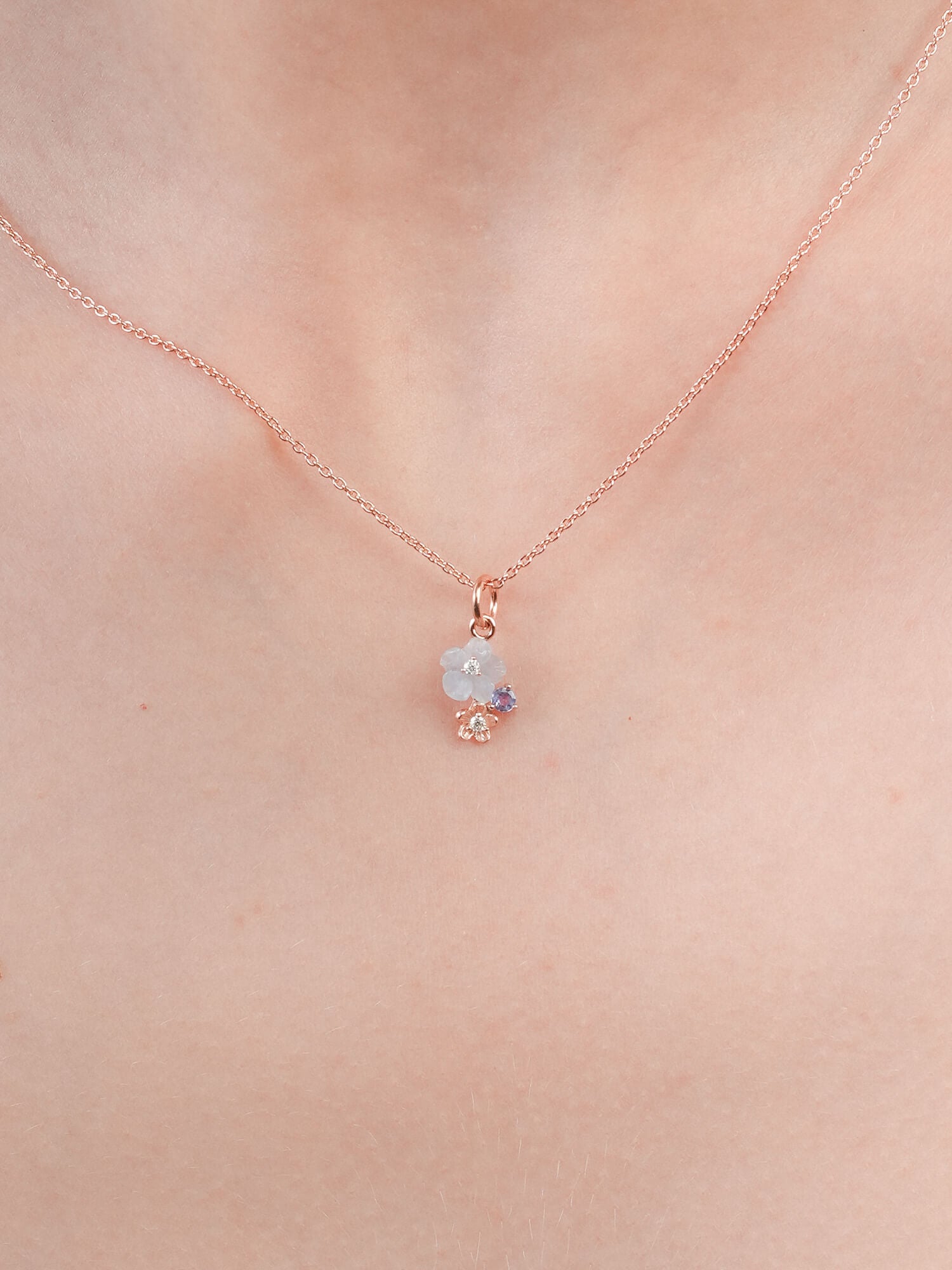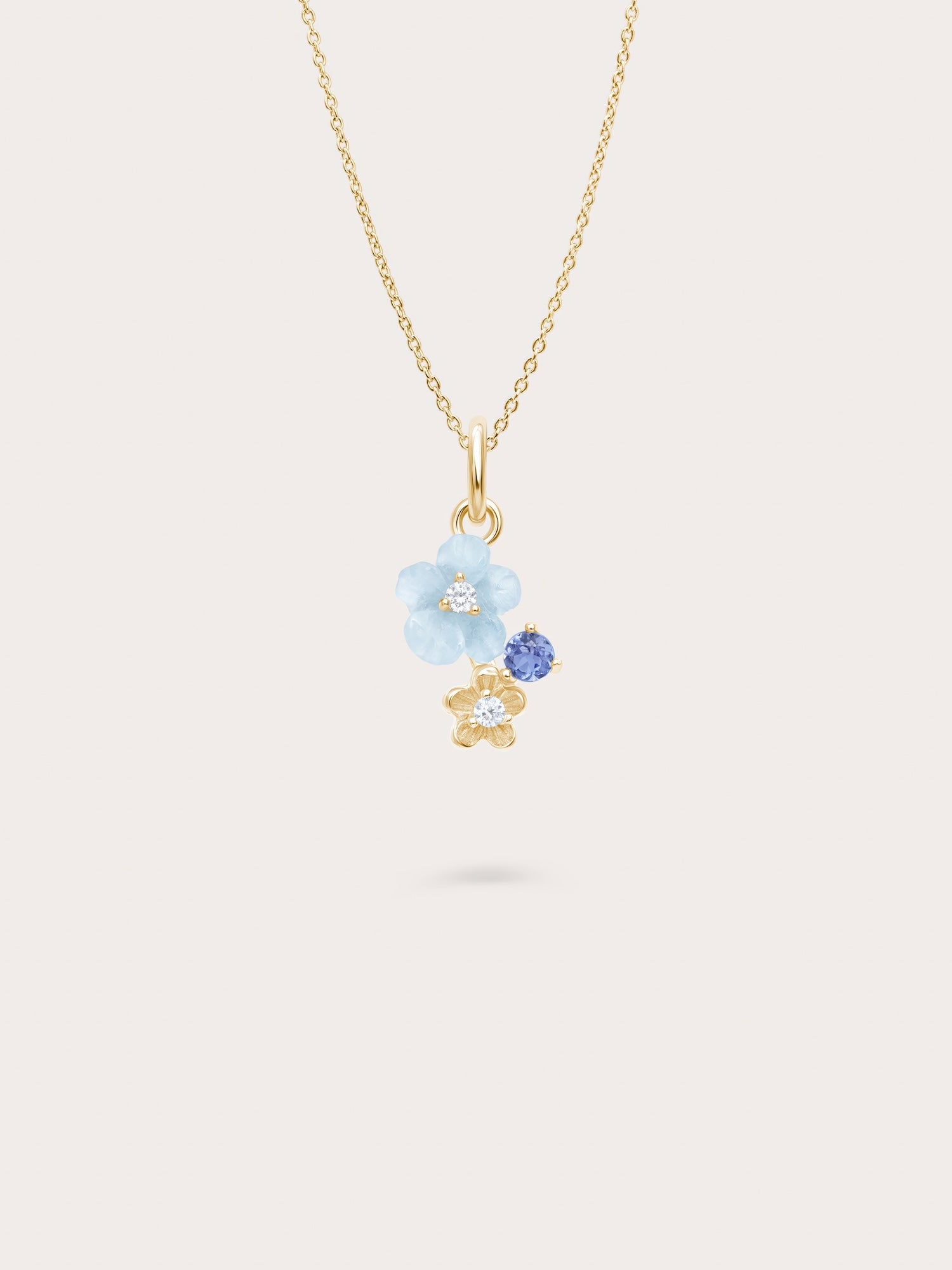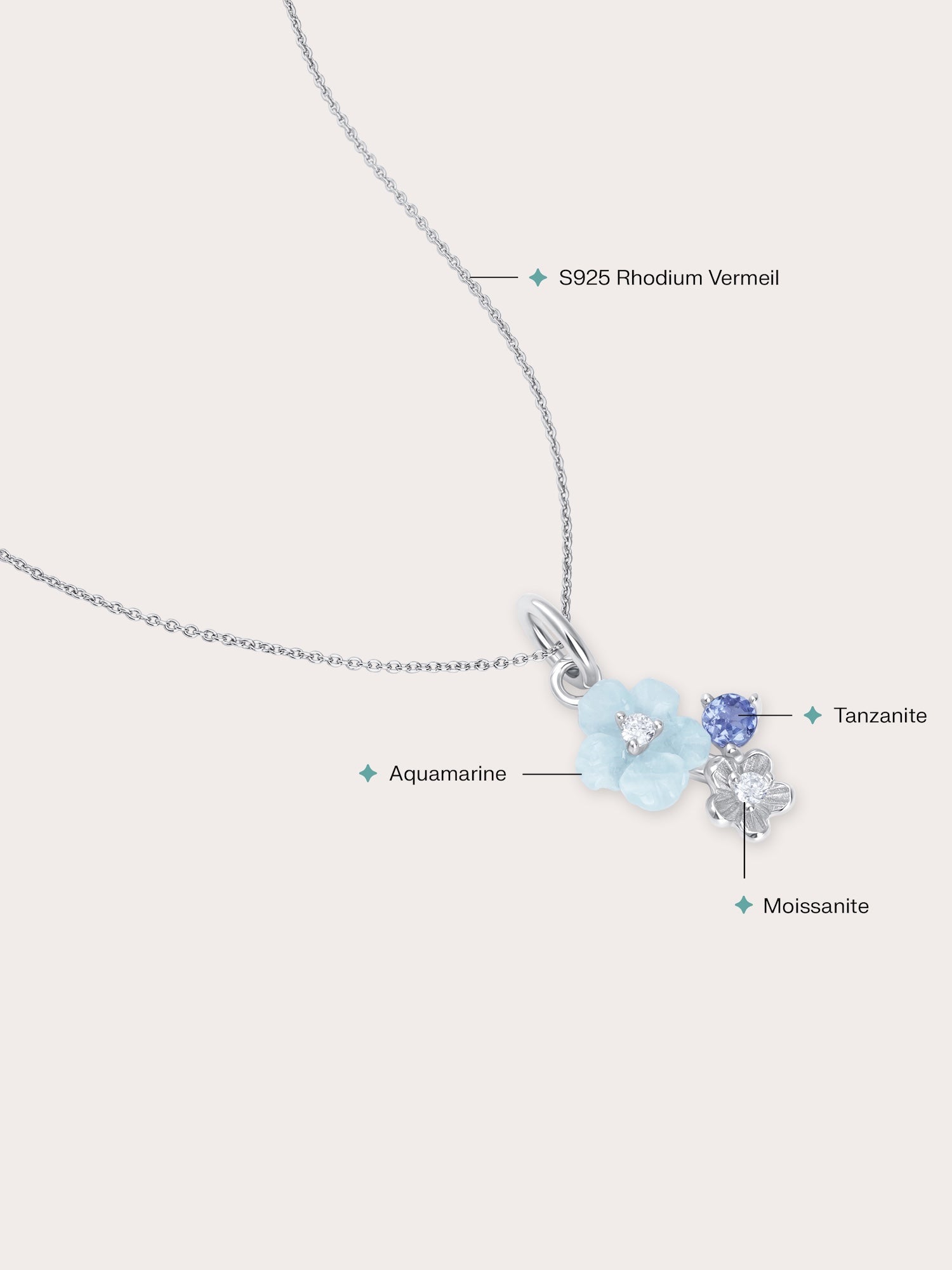 Delicate in size and soft in colour. The Dainty Blue Cluster Flower Pendant Necklace features a hand-carved aquamarine flower, a round tanzanite gemstone, and a polished metal bloom set with a moissanite centre. Handcrafted in 18k gold vermeil.
