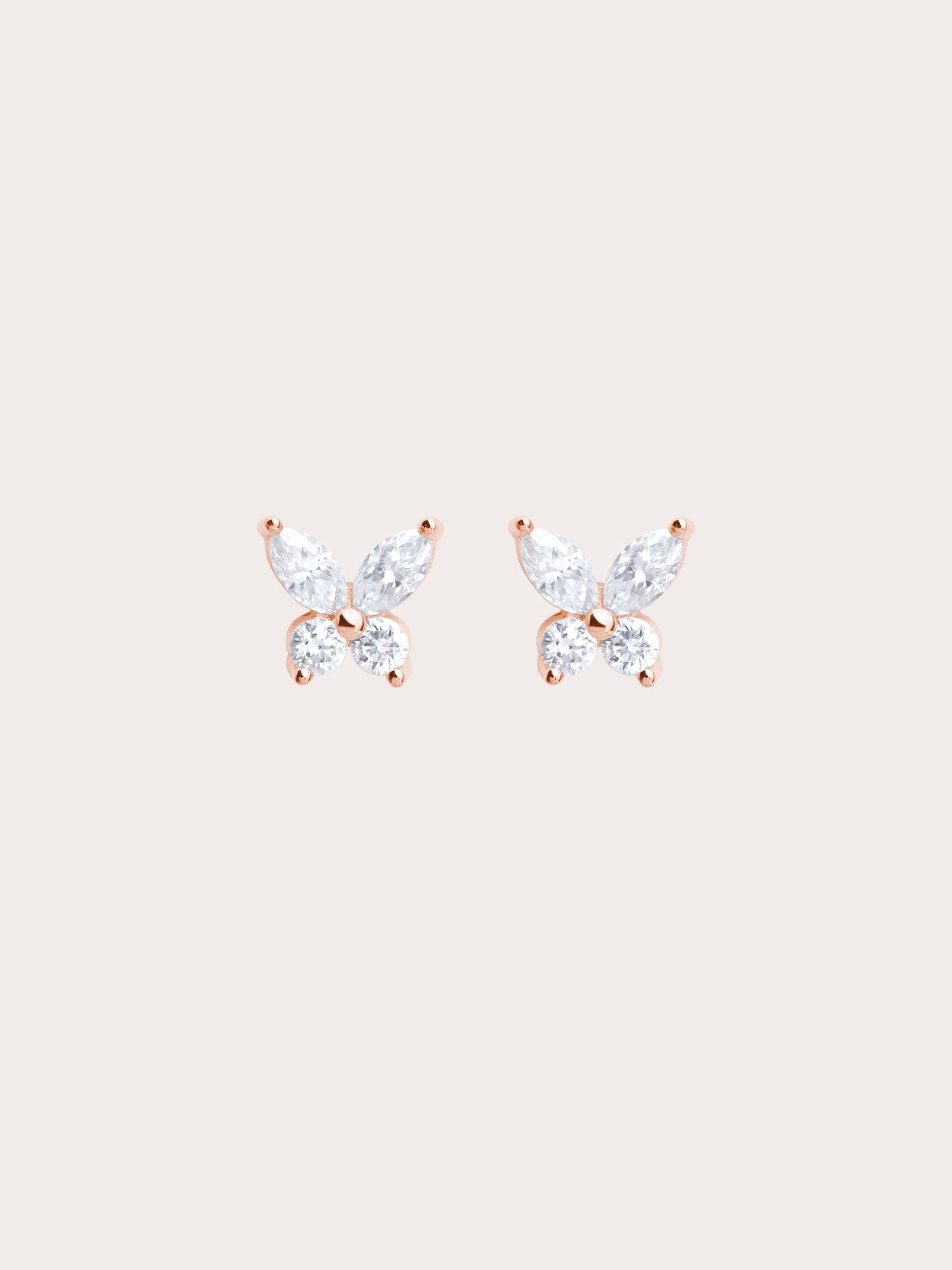 The Moissanite Butterfly Stud Earrings feature delicate butterfly silhouettes set with marquise and round brilliant moissanites, offering a soft, balanced sparkle. Handcrafted in 18k gold vermeil.