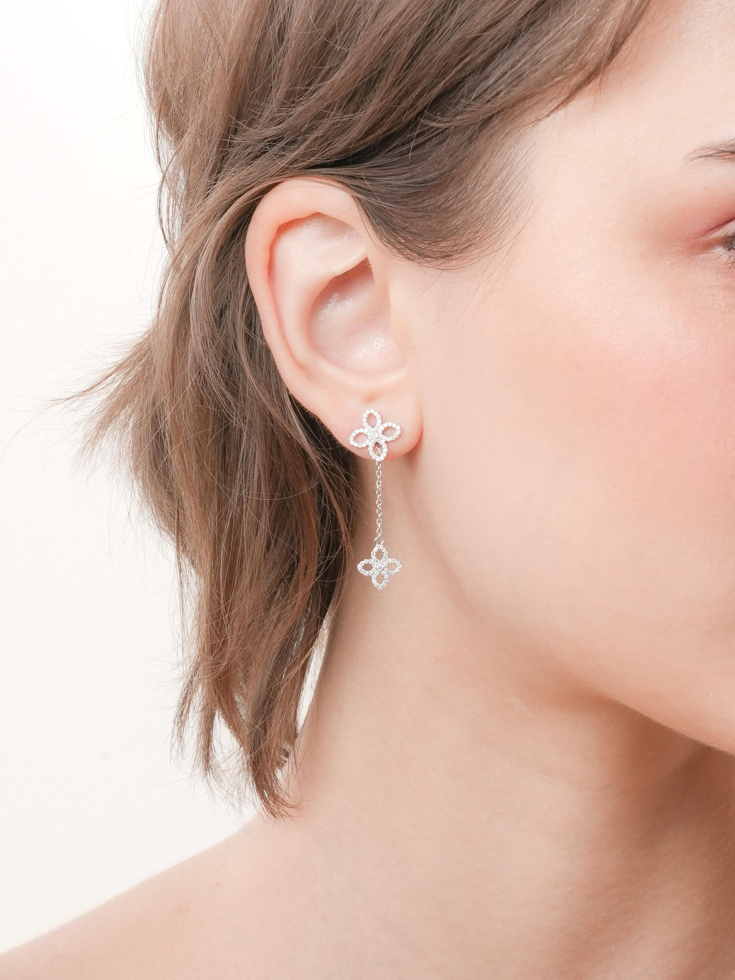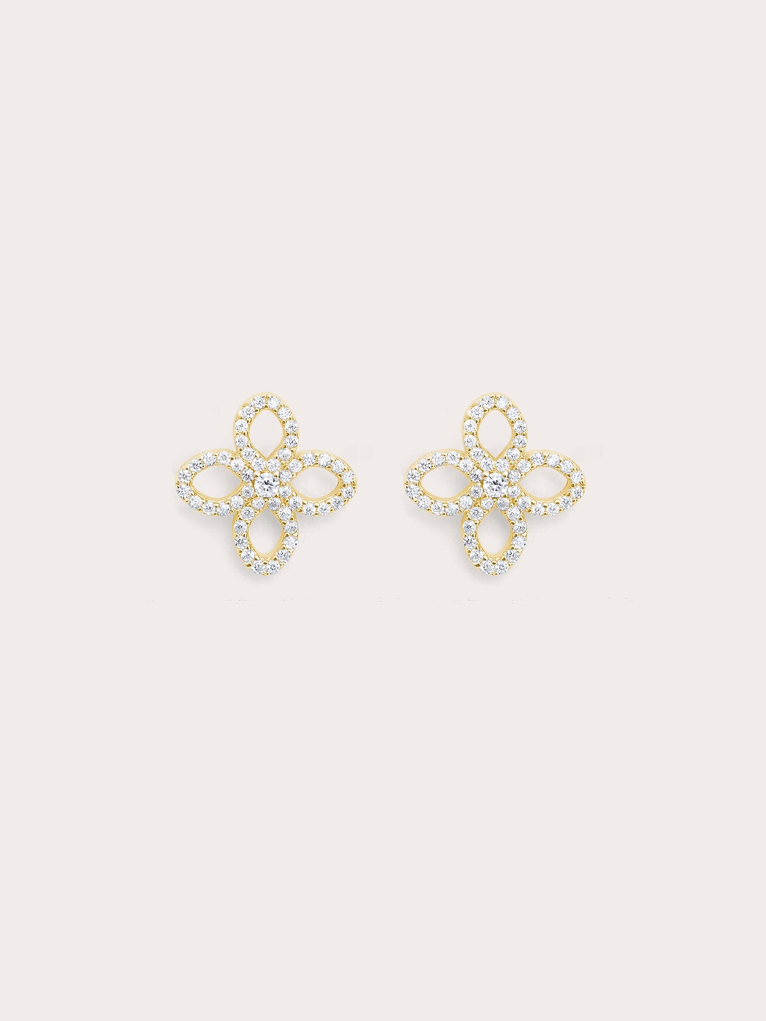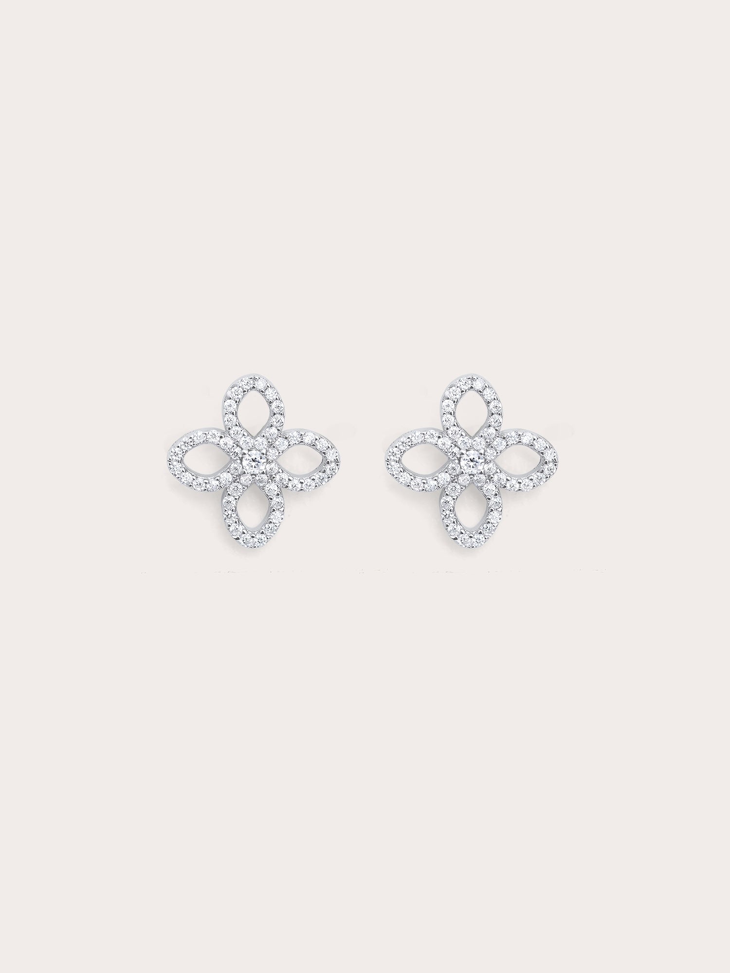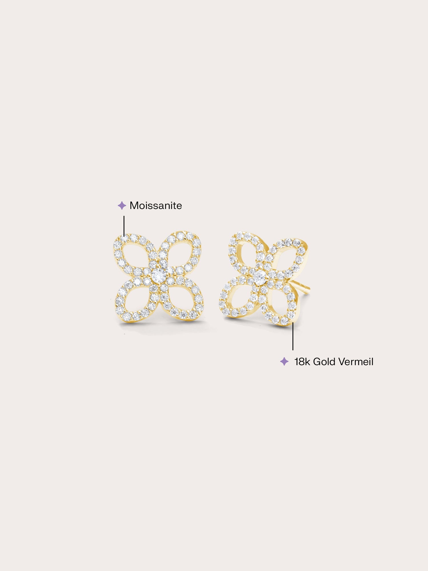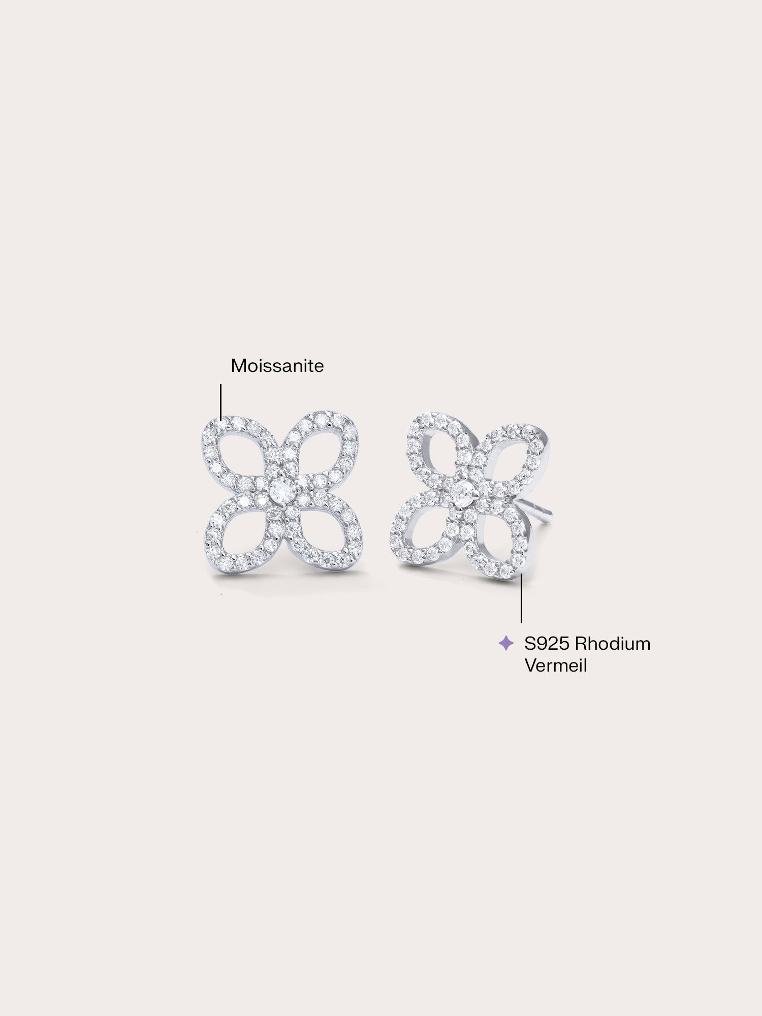 The Pavé Moissanite Clover Stud Earrings feature delicate four-leaf clovers, pavé-set with brilliant white moissanites that catch the light with every movement. Handcrafted in s925 rhodium vermeil.