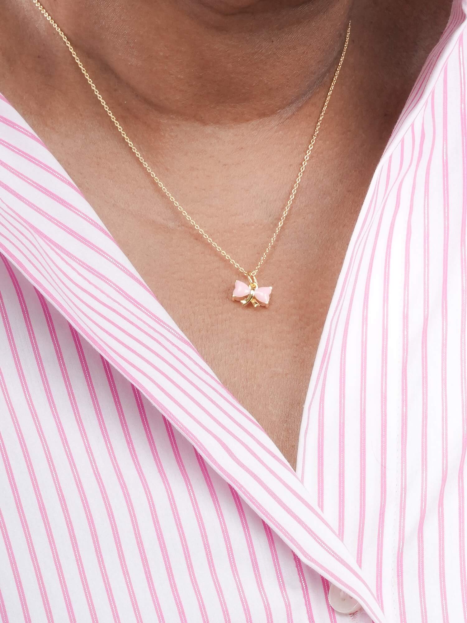 This reversible necklace feature a ribbon design inspired by two hearts and the iconic pink ribbon — a universal symbol of breast cancer awareness and solidarity. One side sparkles with heart-shaped moissanites, while the other shines with puffy pink enamel, allowing for different looks with one necklace. Handcrafted in 18k gold vermeil.