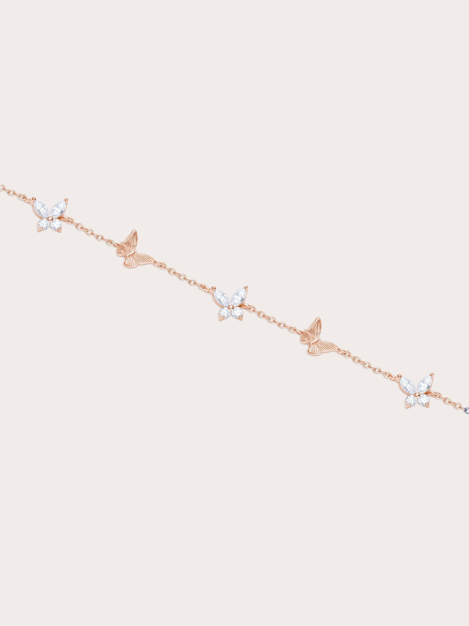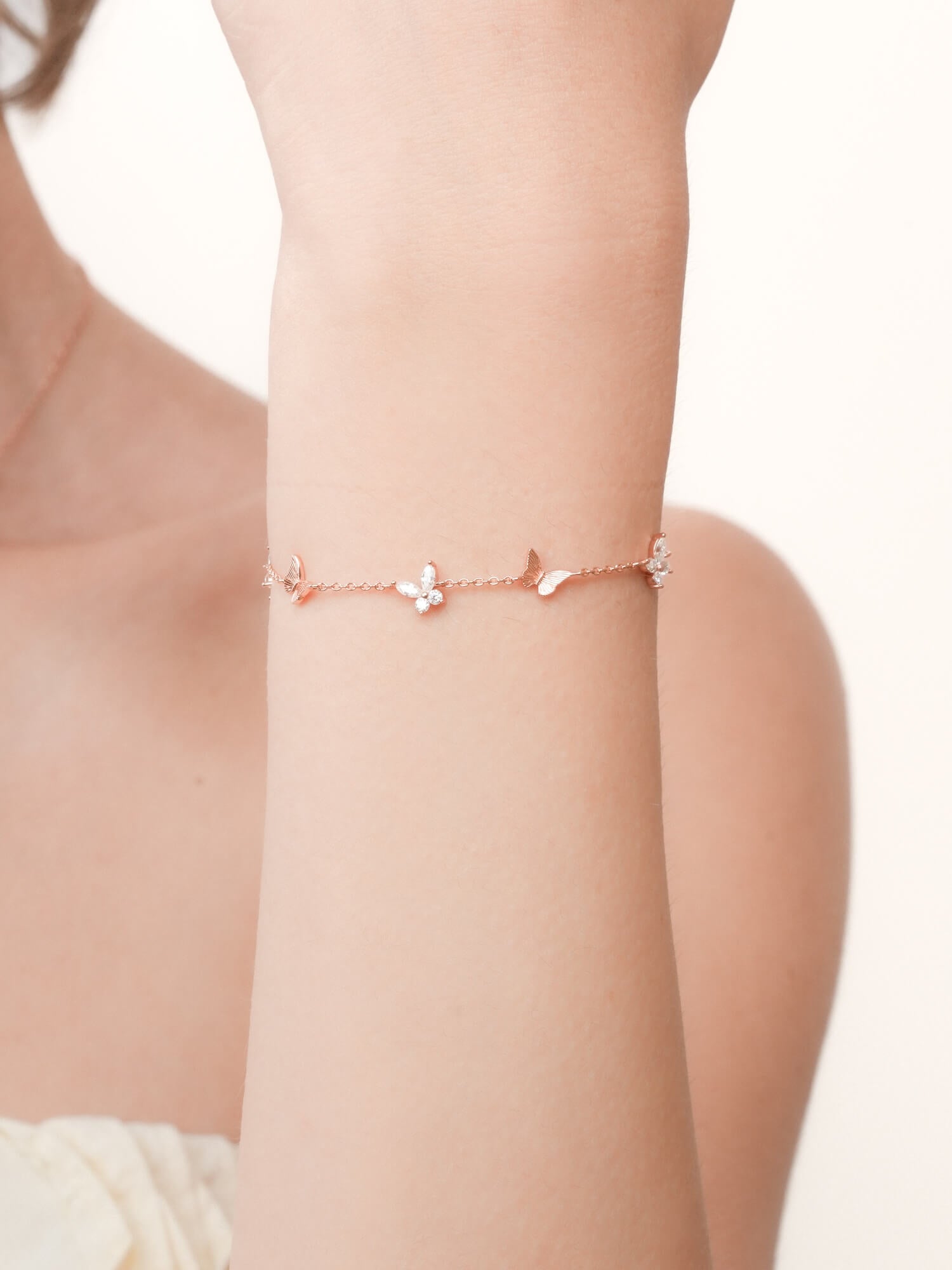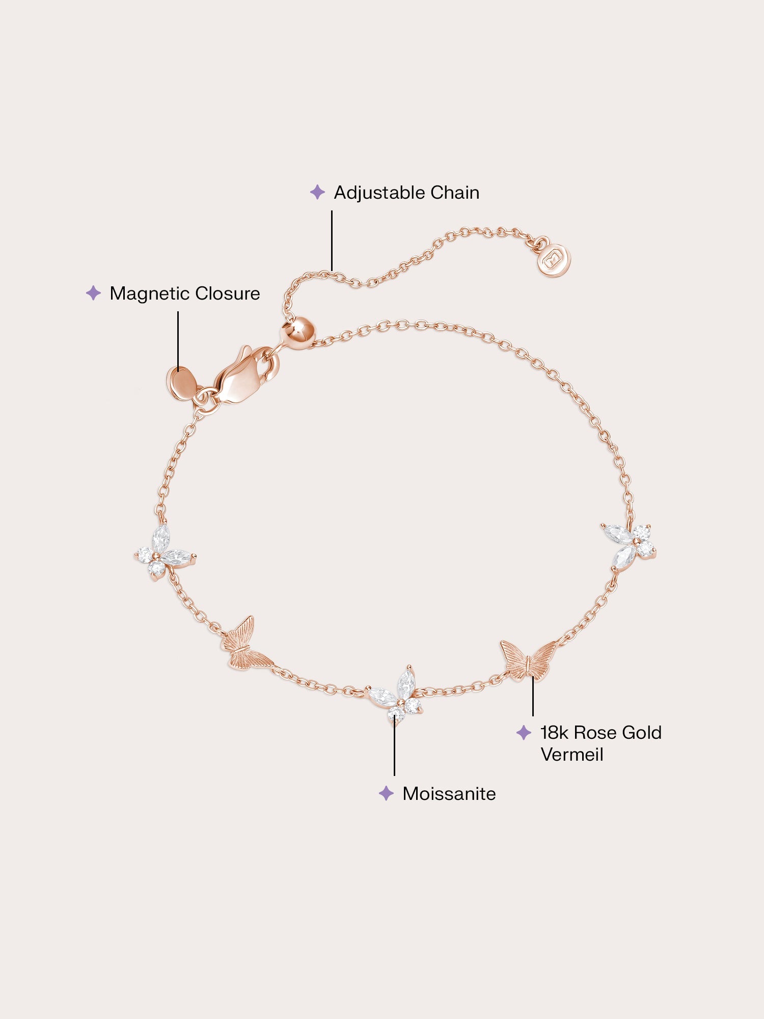 Our Soft Flutter Butterfly Charm Bracelet in White is crafted from 18k rose gold vermeil, a premium material that offers superior durability and a luxurious finish. With a thick layer of 18k rose gold (at least 5 times thicker than standard plating) meticulously plated on s925 sterling silver, 18k rose gold vermeil provides: