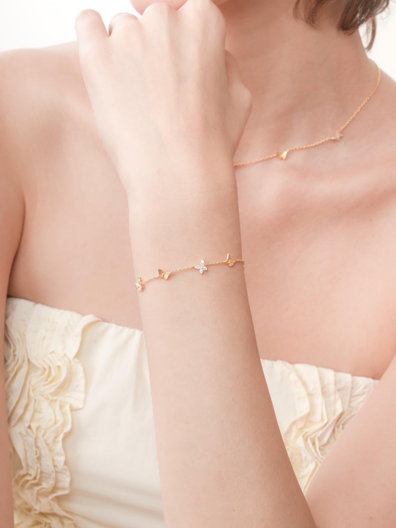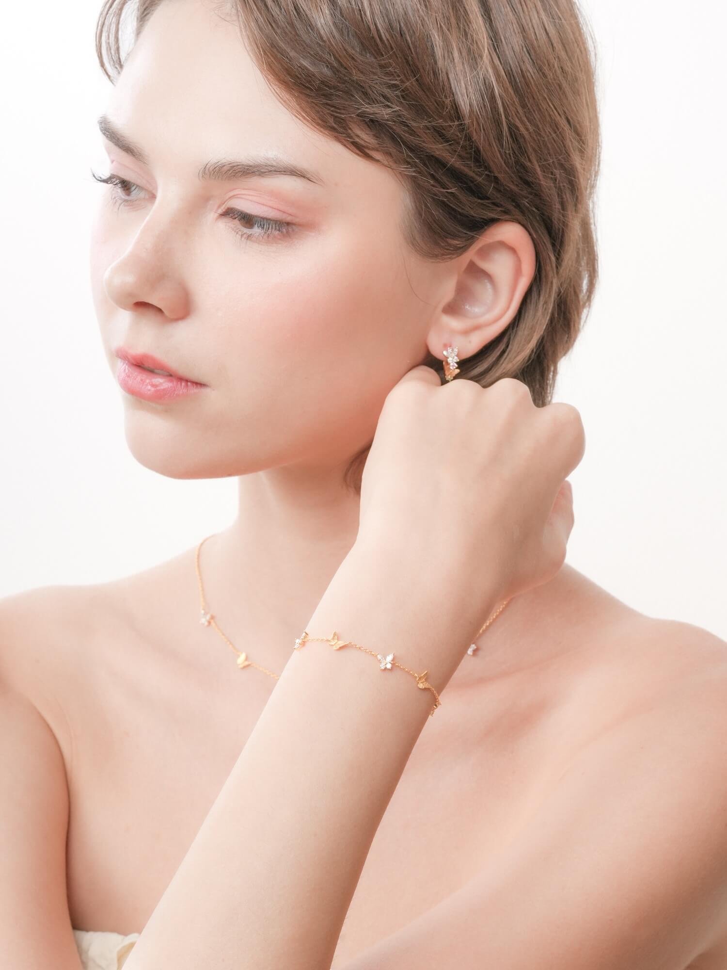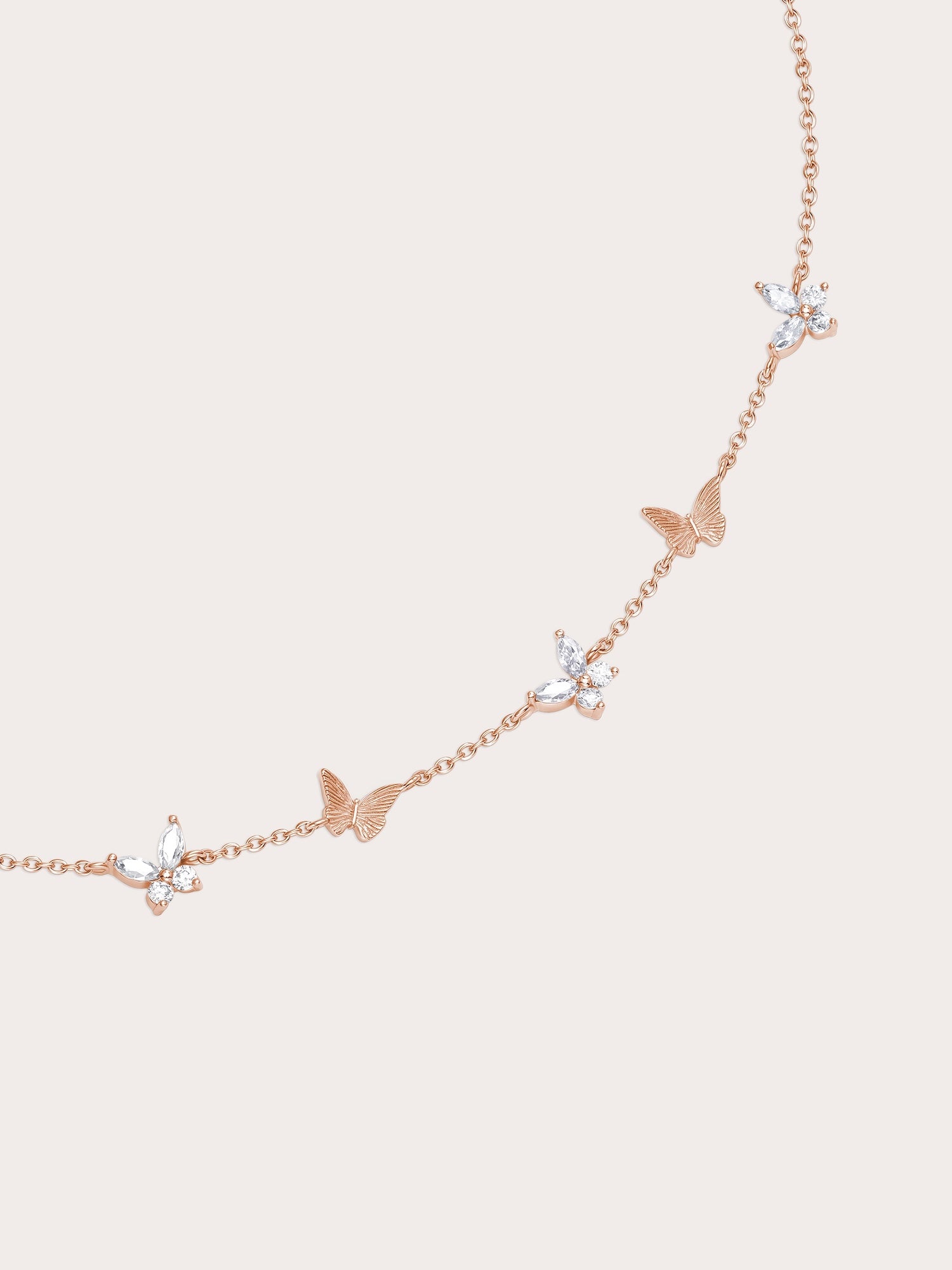 Our Soft Flutter Butterfly Charm Bracelet in White is crafted from 18k rose gold vermeil, a premium material that offers superior durability and a luxurious finish. With a thick layer of 18k rose gold (at least 5 times thicker than standard plating) meticulously plated on s925 sterling silver, 18k rose gold vermeil provides: