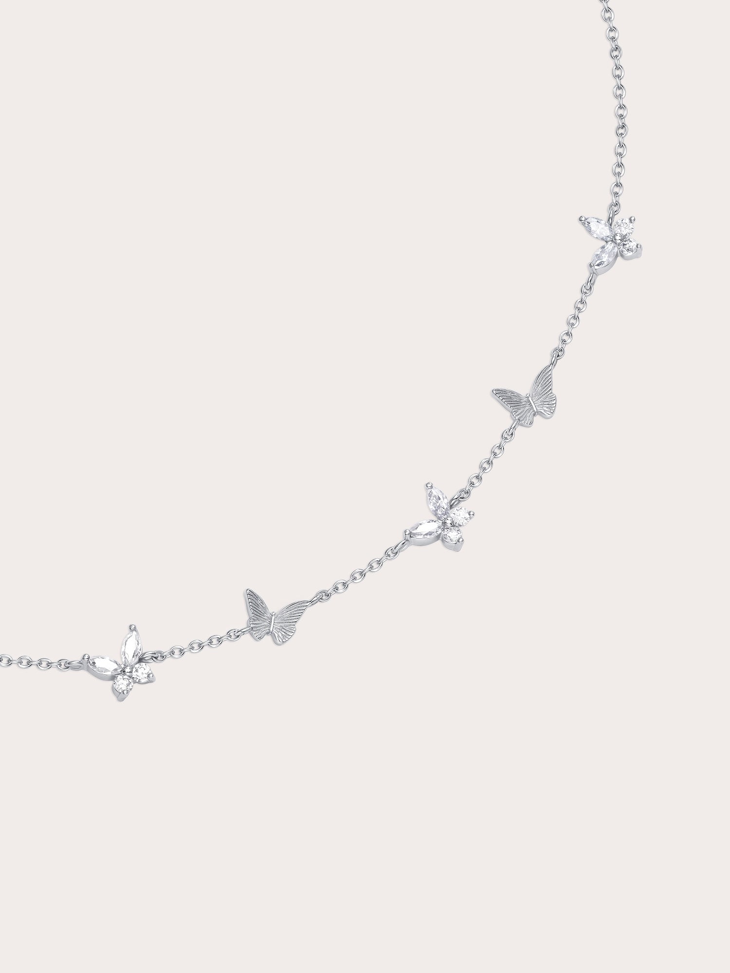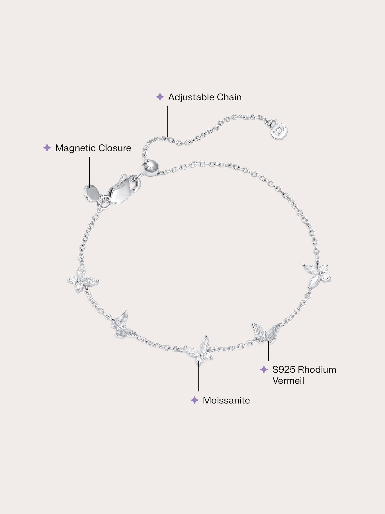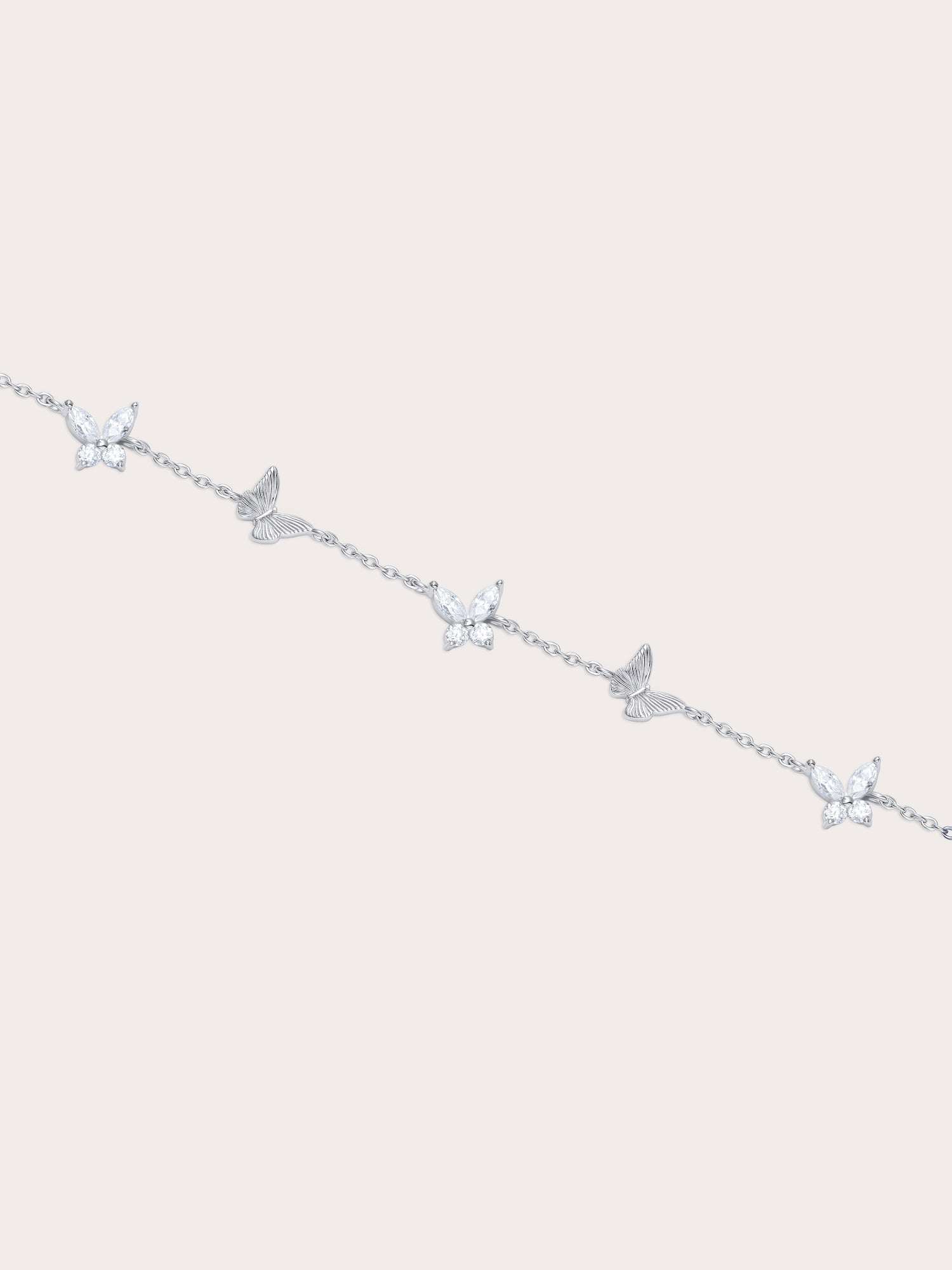 The Soft Flutter Butterfly Charm Bracelet – White features alternating butterfly motifs in textured metal and brilliant white moissanites, arranged along a fine chain.