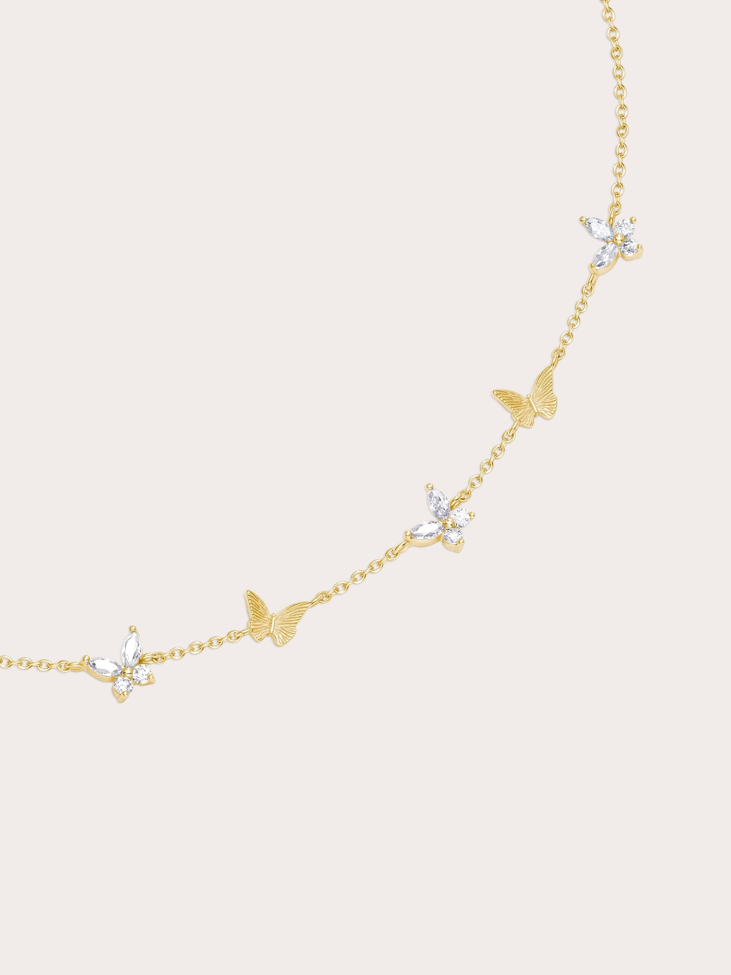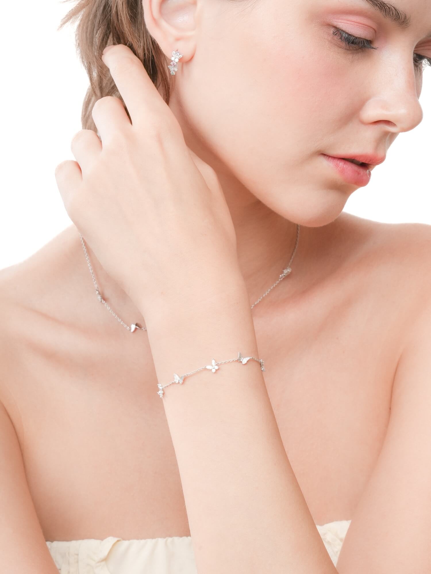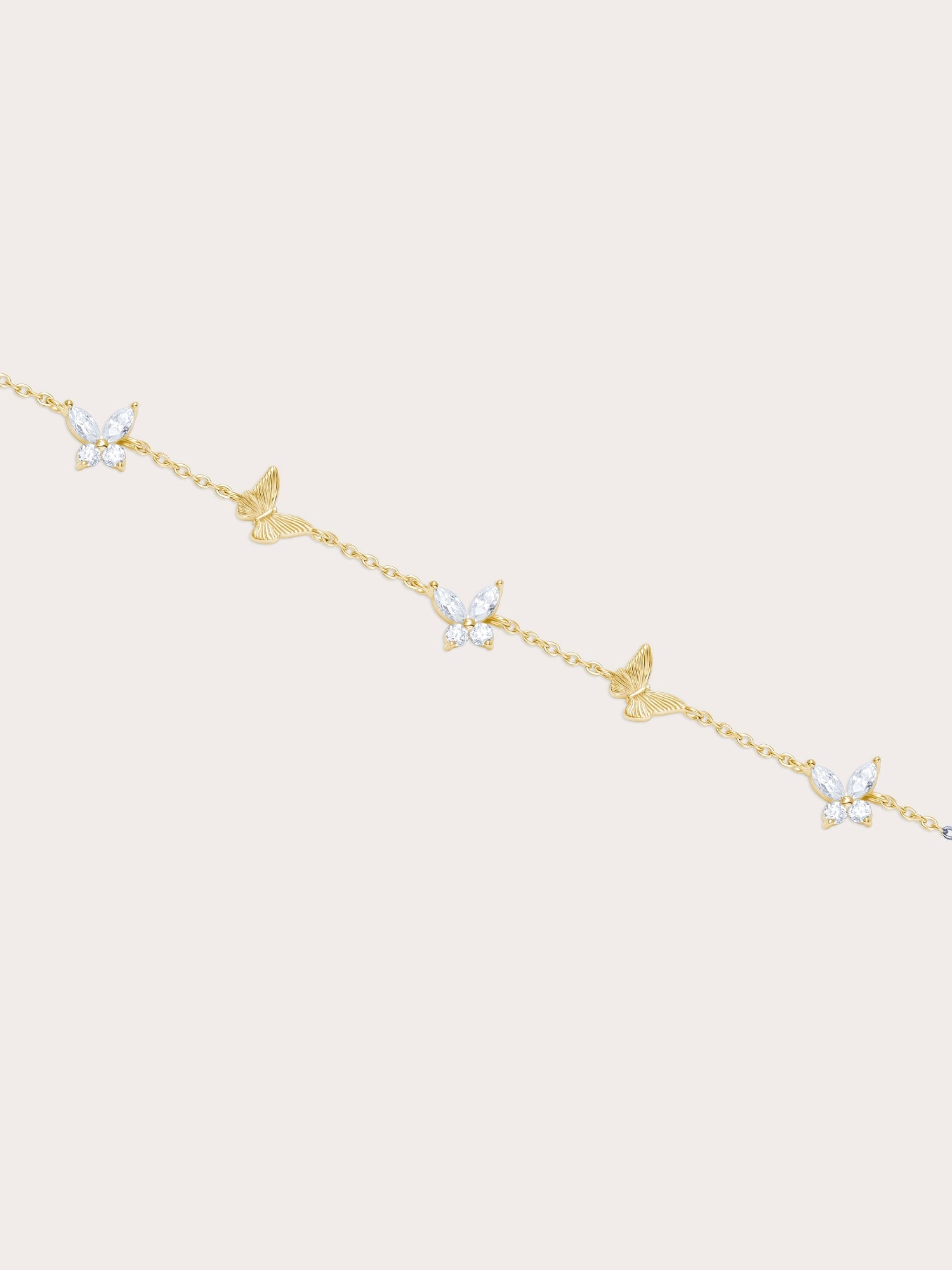 The Soft Flutter Butterfly Charm Bracelet – White features alternating butterfly motifs in textured metal and brilliant white moissanites, arranged along a fine chain.