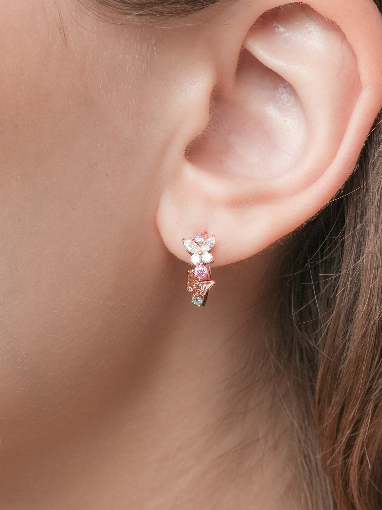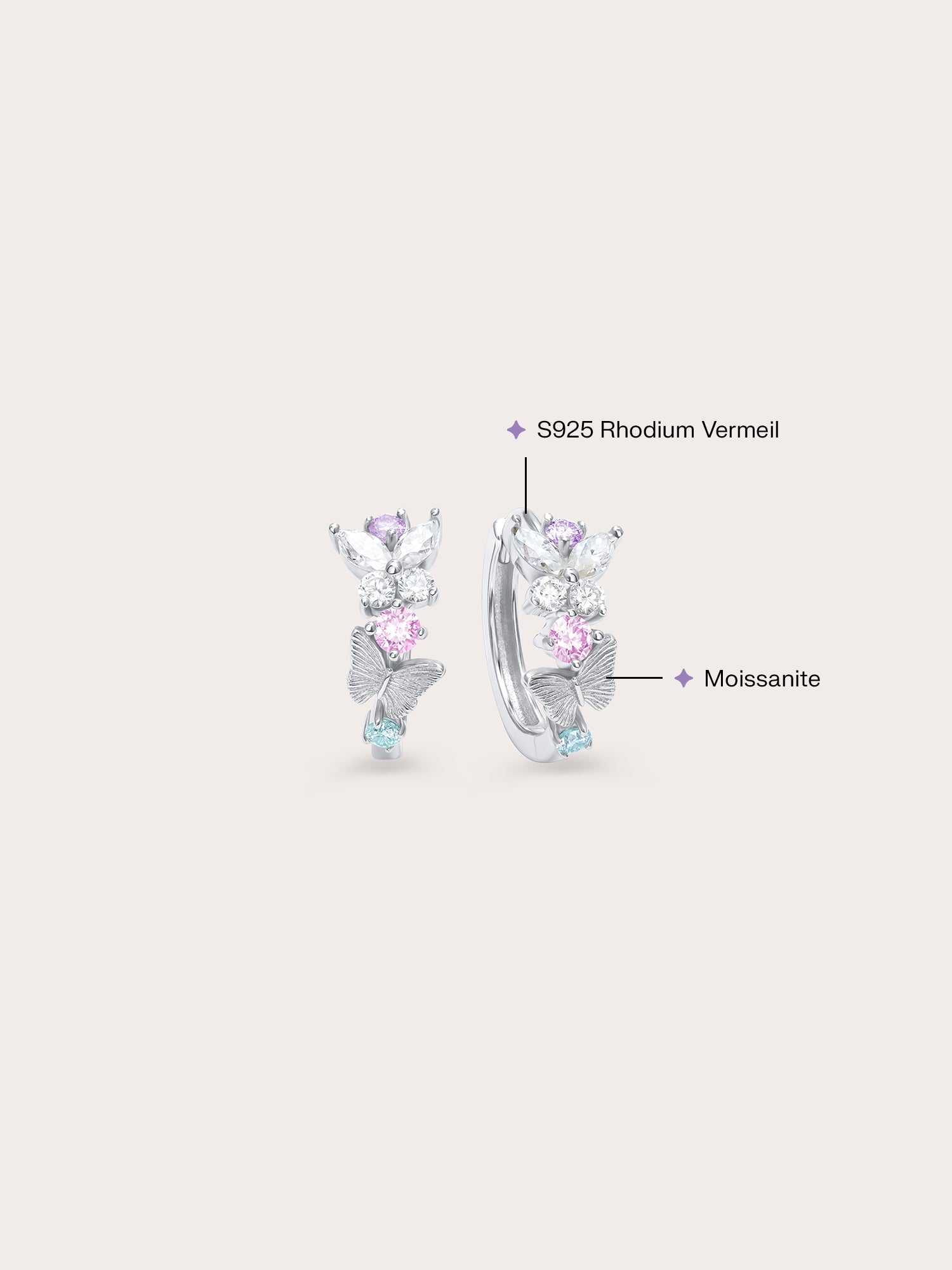 The Soft Flutter Butterfly Huggie Earrings feature butterfly motifs set with marquise and round brilliant moissanites, paired with a softly textured butterfly in polished metal and accented with pink, lilac, and teal moissanites.