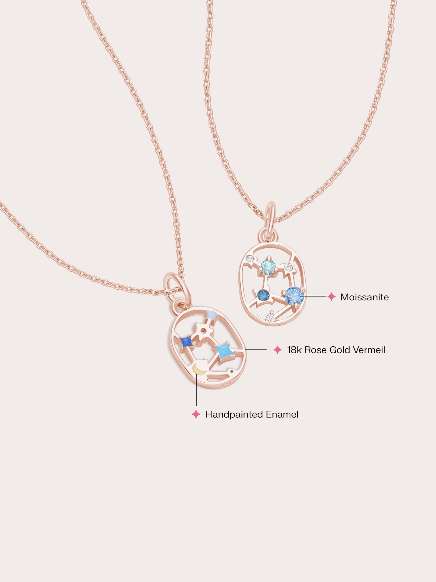 This Virgo zodiac necklace features brilliant moissanites in icy to deep blue hues, forming a subtle gradient that brings the constellation to life. On the reverse side, a hand-painted enamel nightscape captures the look of a starry night, giving you two ways to wear your zodiac story. Handcrafted in 18k rose gold vermeil.